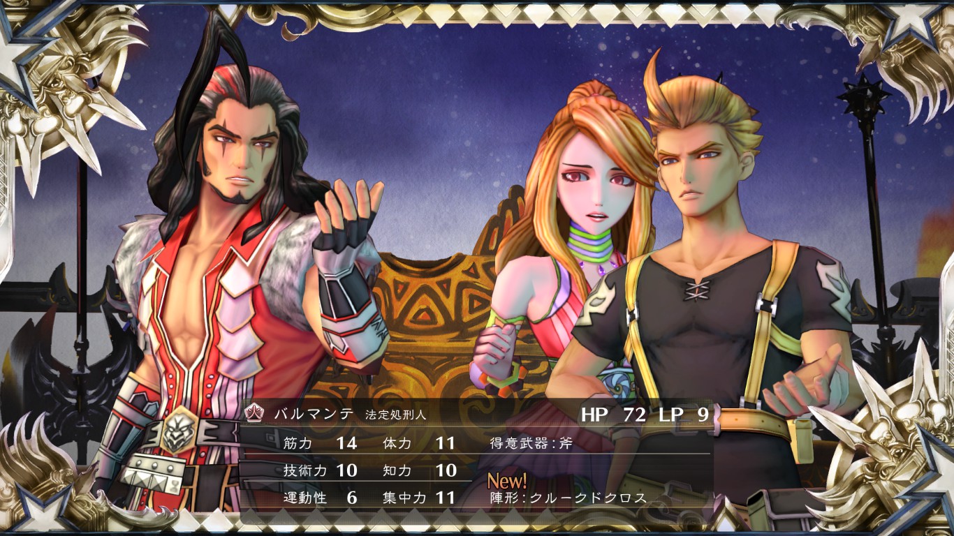 初回プレイでバルマンテが主人公に選ばれる可能性は、タリア同様に低めです。シナリオは分かりやすい半面、初期メンバーが使い辛い上に加入する仲間も少ないので、初回プレイにはあまりお勧めしません。得意武器は処刑人らしく斧ですが、何を使わせてもいける万能型でもあります。