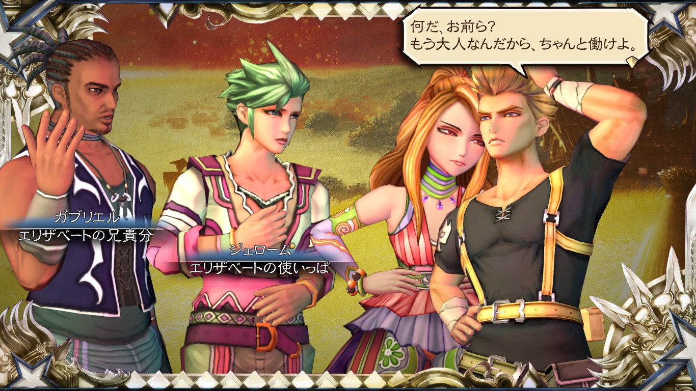 レオナルド編では、序盤のうちにウルピナ(長剣)、タリア(杖)、バルマンテ(斧)といった他の主人公達も仲間にできます。逆にレオナルド自身も、他の主人公達の物語で仲間にできます。