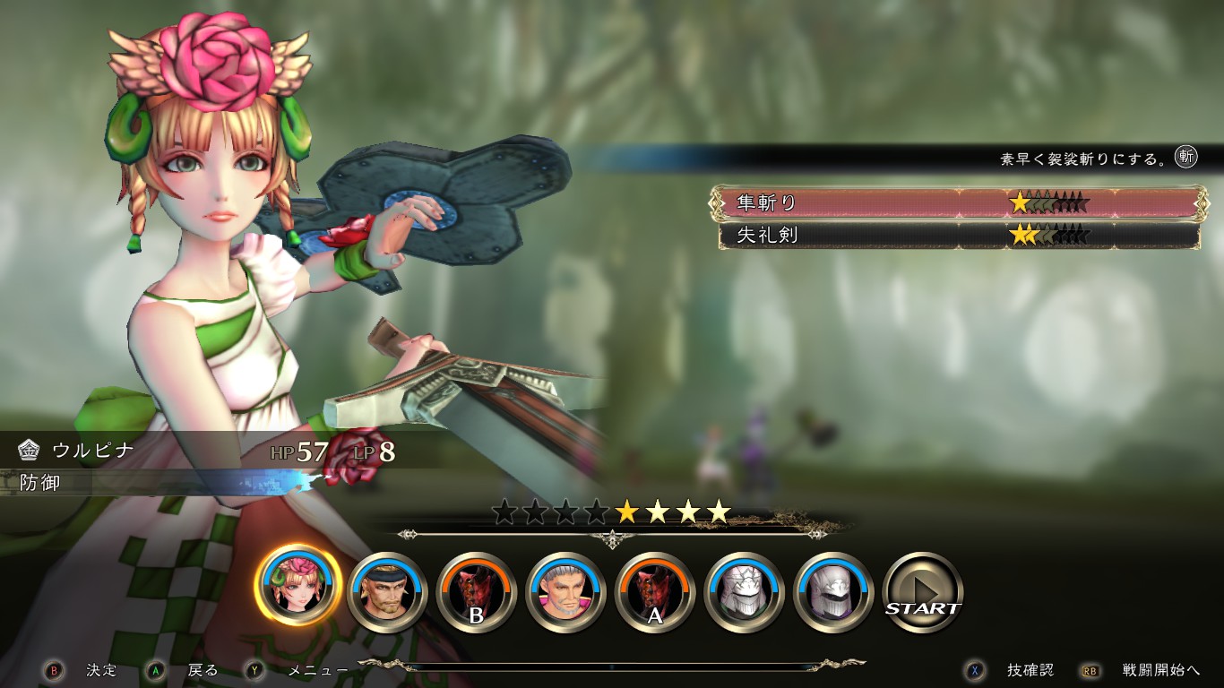 大剣の基本技ですが、ランク0のとき消費BPが2なので、バトルメンバー編成時に気をつけて下さい。陣形「グレータークロス」なら、大剣の消費BPを抑えることができます。斬・打の2つの属性を合わせ持つので、敵のインタラプト技に注意して下さい。