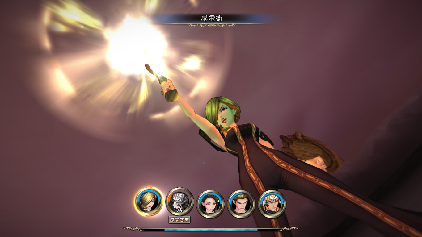 敵の打属性攻撃に反応するインタラプト技で、敵全体に小ダメージを与えつつ、マヒの状態異常をもたらします。マヒの成功率は1割程。ダメージは低いとは言え、全体攻撃なのと、マヒが成功したときの効果が侮れないので、結構頻繁に使える技です。