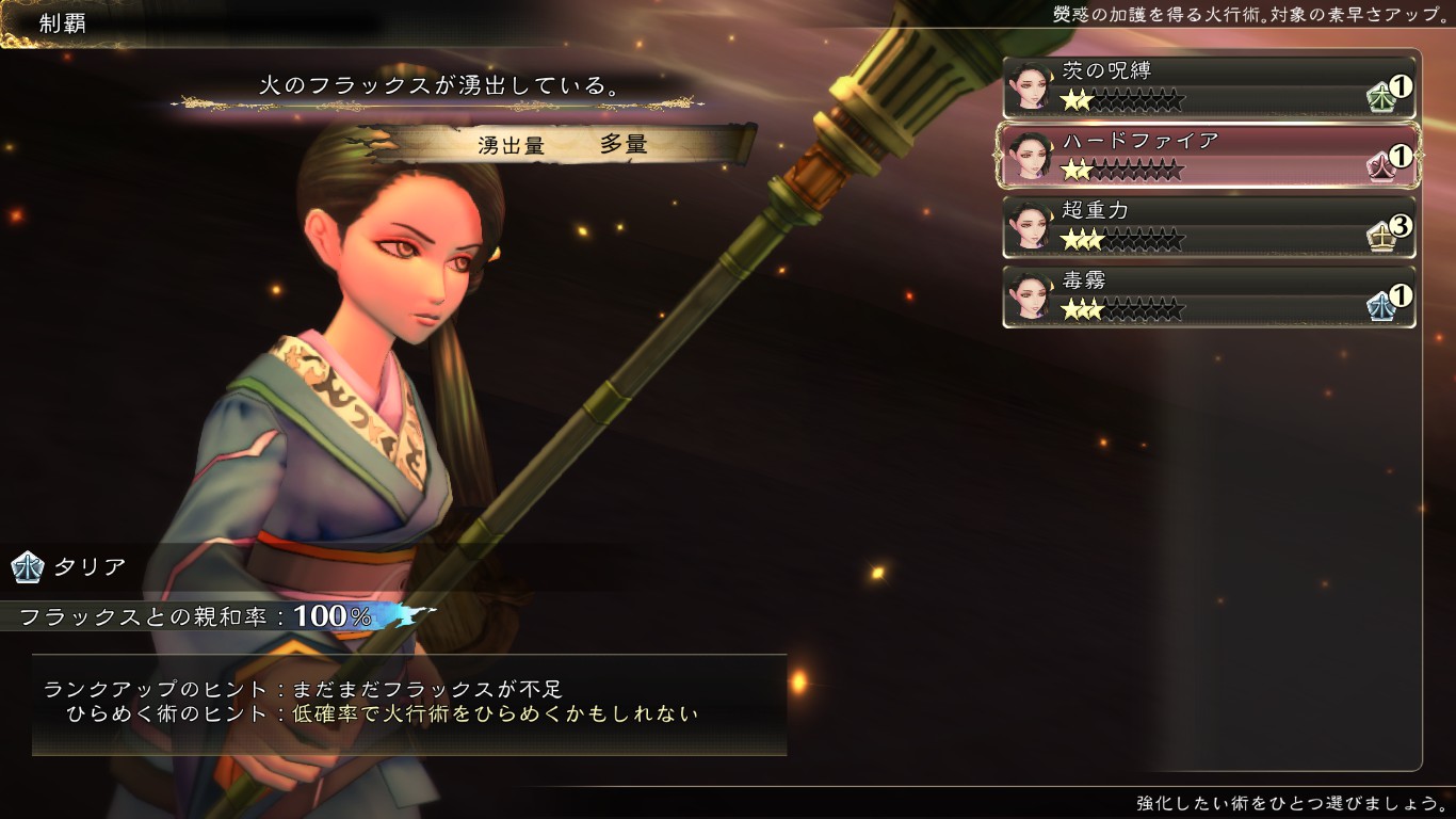 基本的には、フラックスを吸収させた術自身のランクアップが行われるか、フラックスを吸収させた術と同じ五行の上位の術を閃くようになっています。